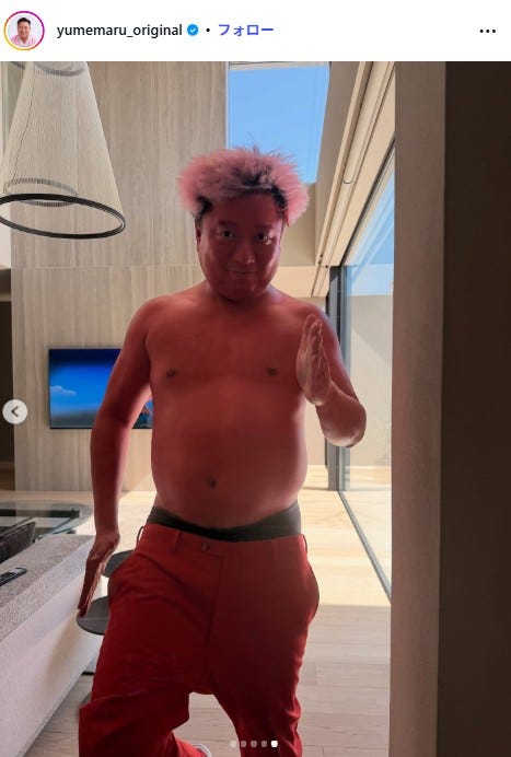 東海オンエア・ゆめまるが4月7日、自身のInstagramを更新。全身が赤く染まった衝撃的な姿を披露...