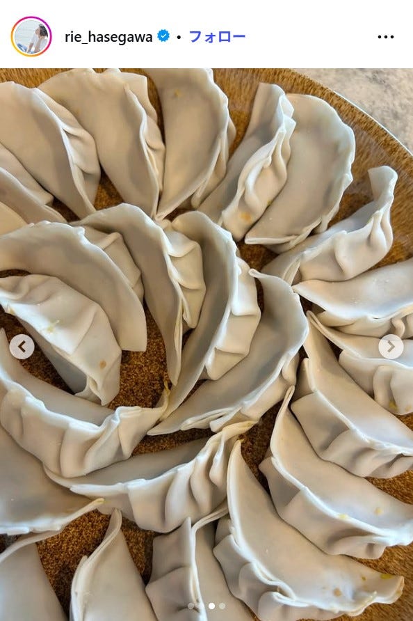 モデルの長谷川理恵が4月8日、自身のInstagramを更新。米粉の皮で作った手作り餃子を公開した。