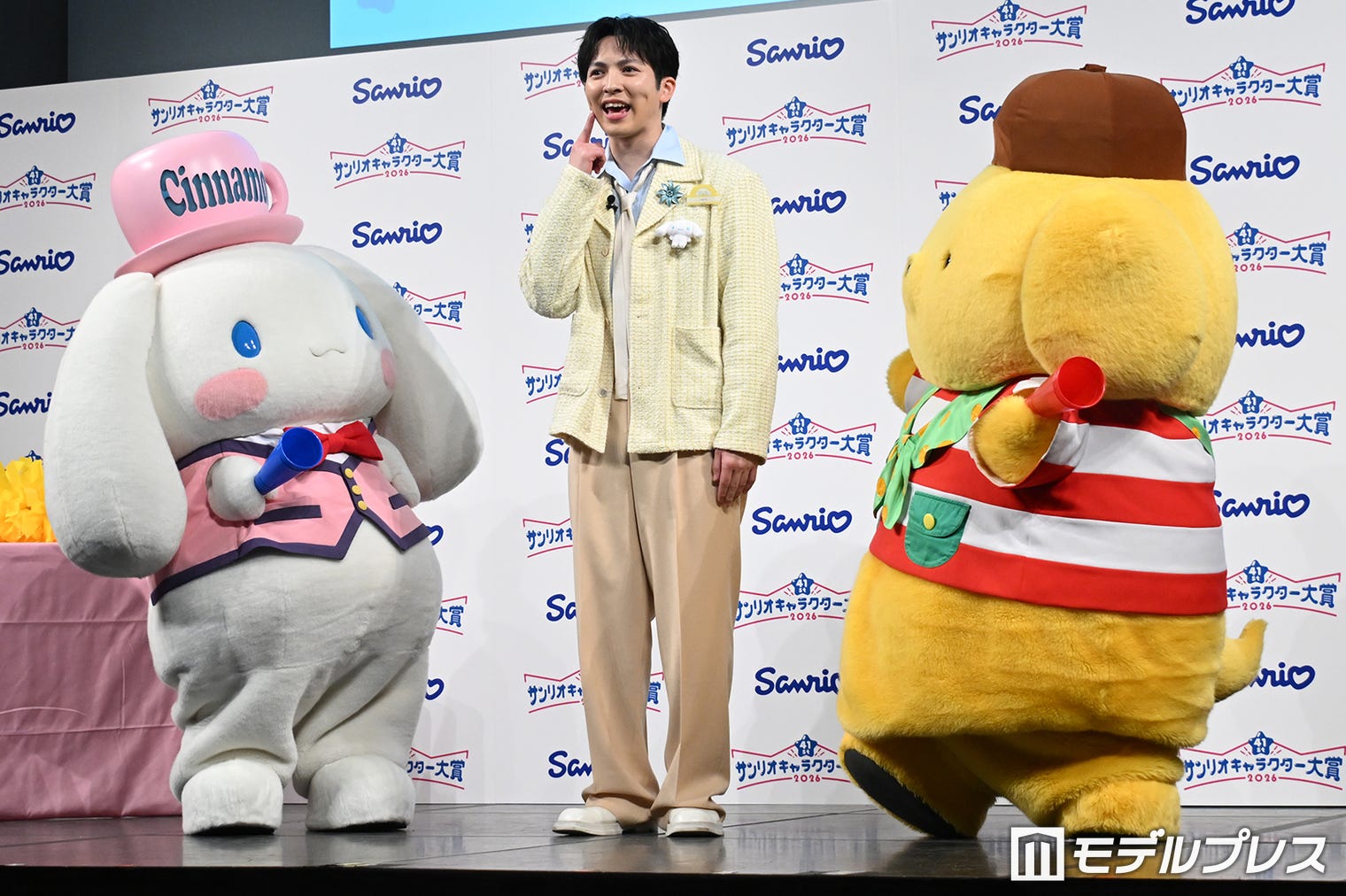 シナモロール・ポムポムプリンと“決めエール”を披露する吉田仁人(C)モデルプレス