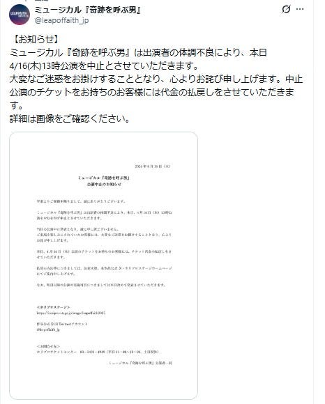 竹内涼真「心からお詫び申し上げます」コメント発表 主演ミュージカル「奇跡を呼ぶ男」公演3時間前に中止
