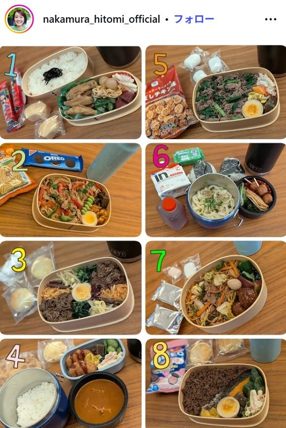 フリーアナウンサーの中村仁美が4月19日、自身のInstagramを更新。8日分の息子の弁当を公開し...