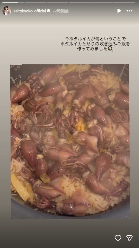齊藤京子「旬ということで」ホタルイカとせりの炊き込みご飯披露「本格的ですごい」「具だくさんで美味しそう」と反響