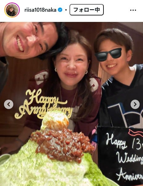 仲里依紗、夫・中尾明慶と“13回目の結婚記念日”12歳息子との3ショット公開「パパそっくり」「幸せ溢れてる」と反響