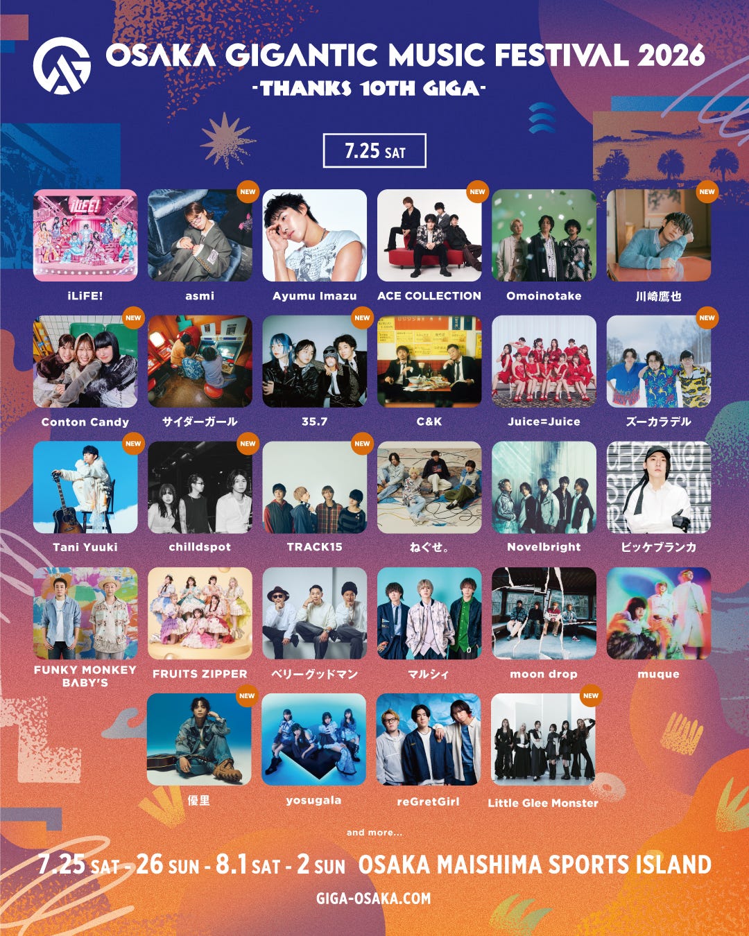 「OSAKA GIGANTIC MUSIC FESTIVAL」7月25日出演アーティスト(提供写真)
