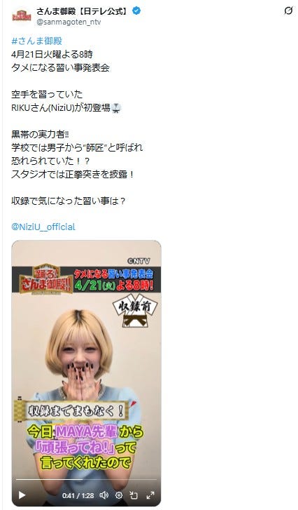 9人組ガールズグループ・NiziU(ニジュー)のRIKU(リク)が4月21日、日本テレビ系「踊る!さ...