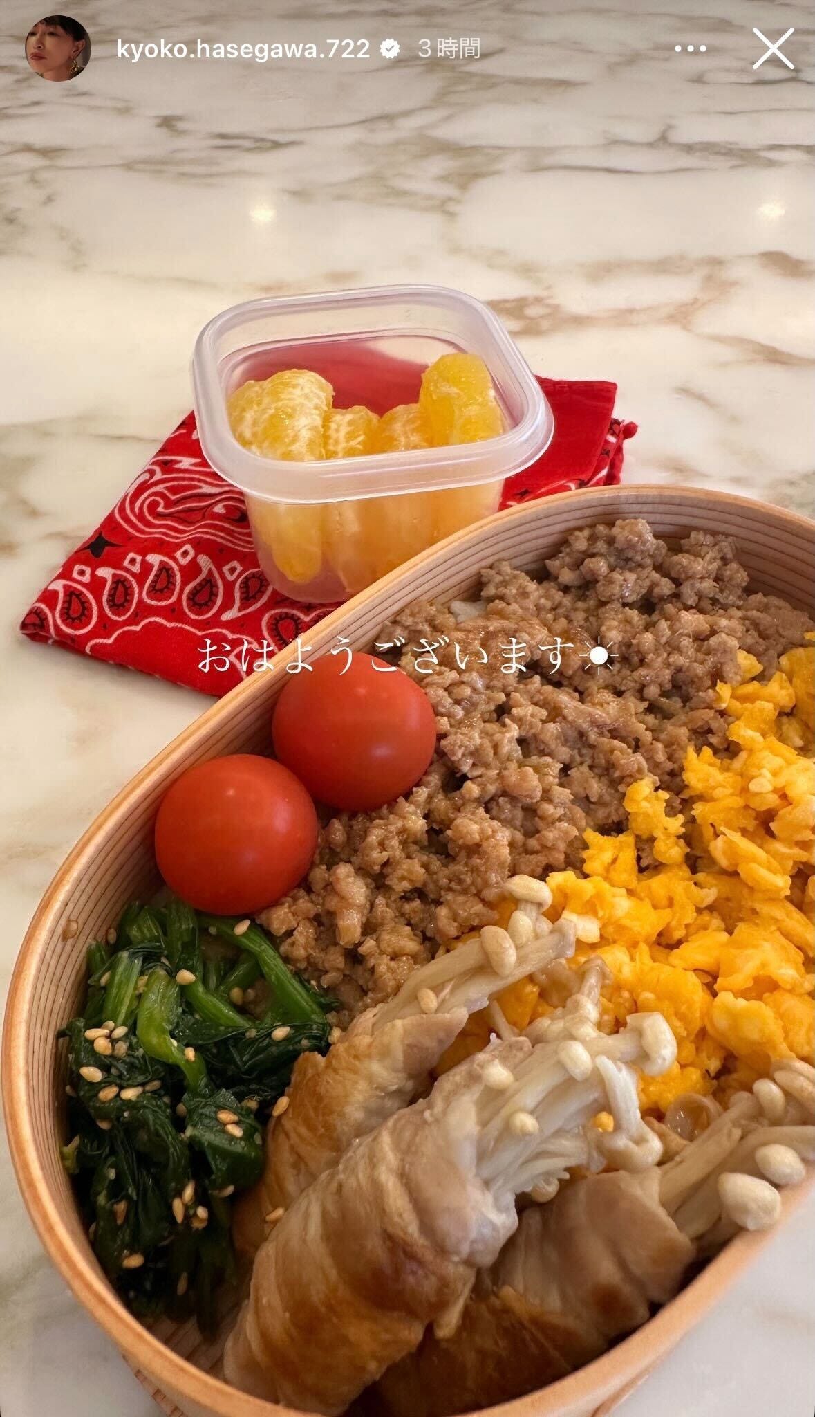 女優の長谷川京子が4月24日、自身のInstagramストーリーズを更新。手作りのそぼろ弁当を公開し...