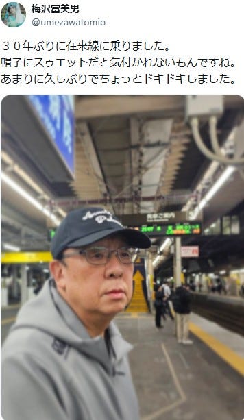 俳優の梅沢富美男が4月25日、自身のX(旧Twitter)を更新。30年ぶりに在来線に乗ったことを報...