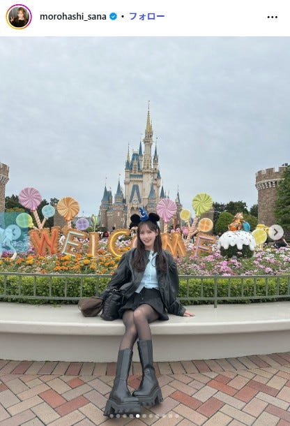 =LOVEメンバー、ミニ丈×タイツ姿で美脚際立つディズニーコーデ披露「スタイルが神」「シンデレラ城より輝いてる」