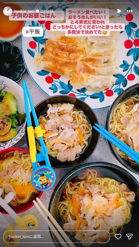 タレントの平愛梨が4月26日、自身のInstagramストーリーズを更新。息子たちの昼食と夕食を公開...
