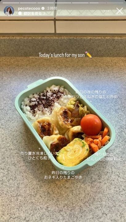 タレントのpecoが4月28日、自身のInstagramストーリーズを更新。息子への手作り弁当を公開...