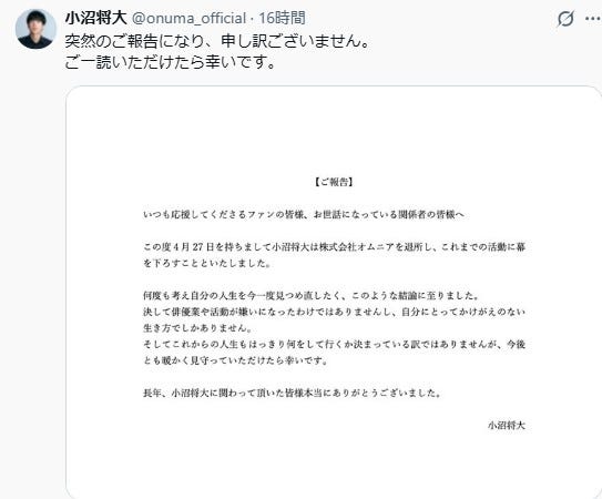 俳優の小沼将大(36)が芸能界を引退することがわかった。4月27日、自身の公式X(旧Twitter)...