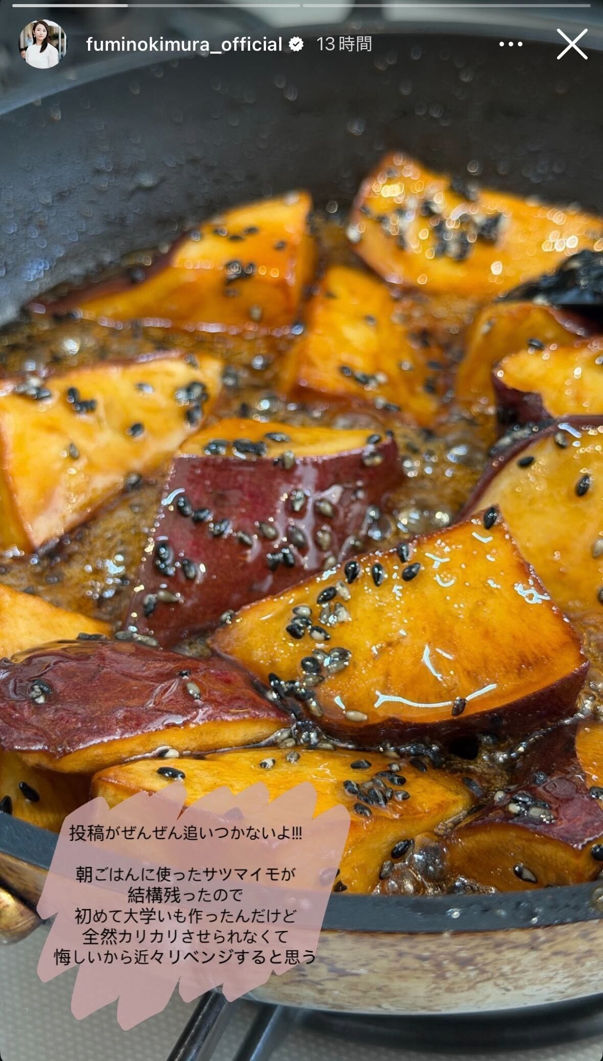 女優の木村文乃が4月28日、自身のInstagramストーリーズを更新。朝食の残りで作った大学芋を公...