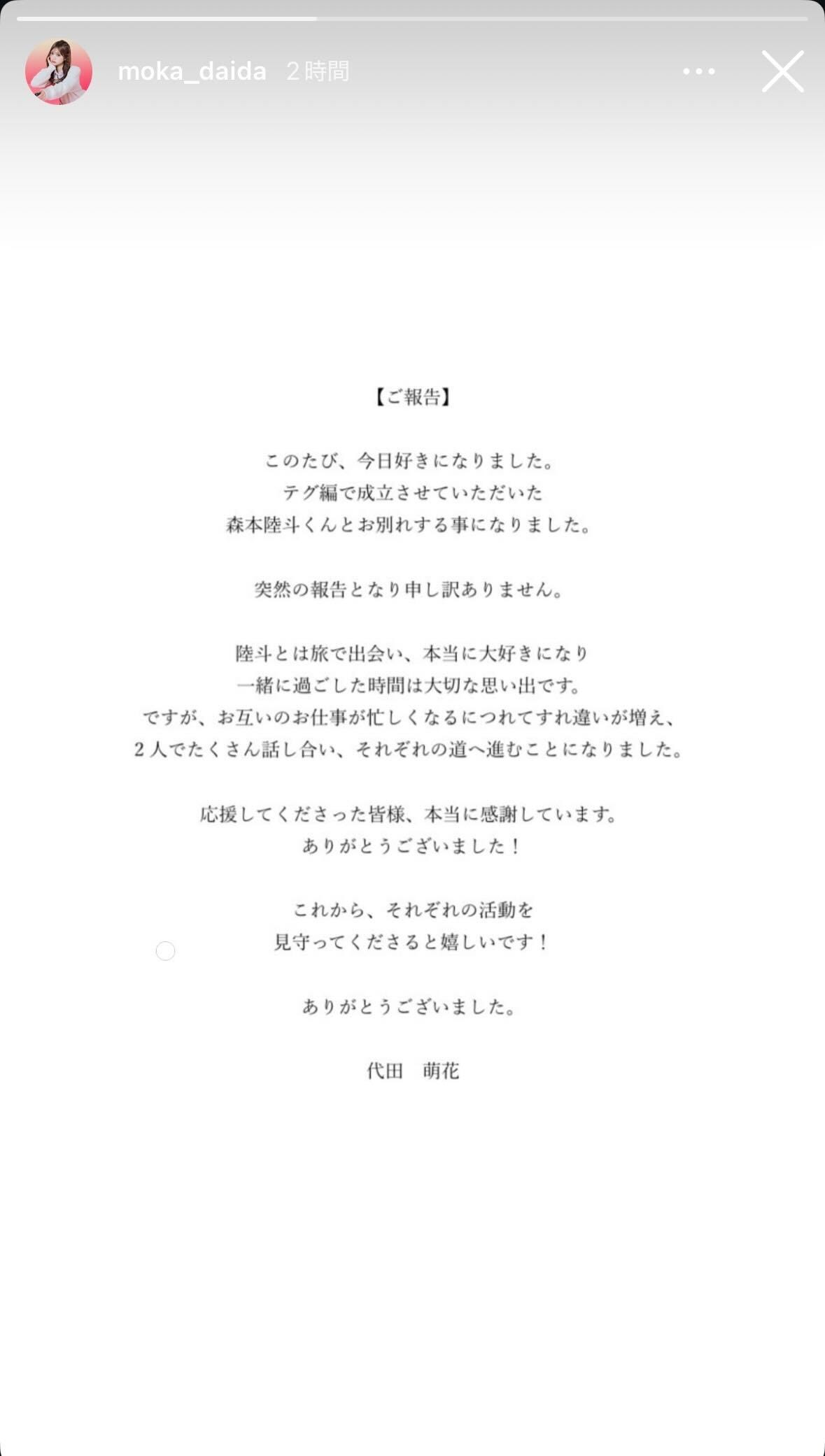 「今日好き」“りくもか”森本陸斗&代田萌花カップル、破局報告「すれ違いが増え」