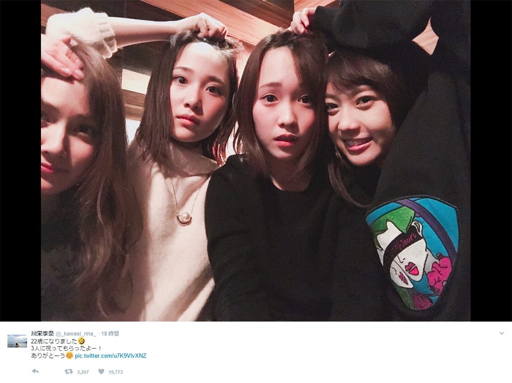 12日、元AKB48で女優の川栄李奈が22歳の誕生日を迎えた。入山杏奈・高橋朱里・木崎ゆりあ(※「崎...