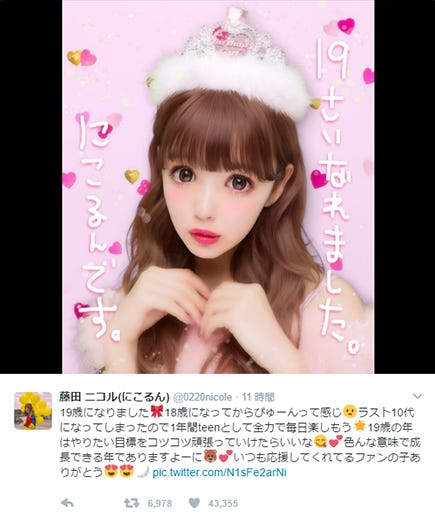 雑誌「Popteen」モデルでタレントの“にこるん”こと藤田ニコルが20日、19歳の誕生日を迎えた。