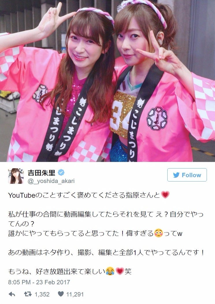 吉田朱里(左)に感激した様子の指原莉乃(右)/吉田朱里Twitterより