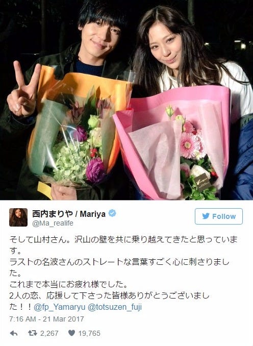西内まりやの頑張りに「みんなが涙」 月9完走でflumpool山村隆太に感謝