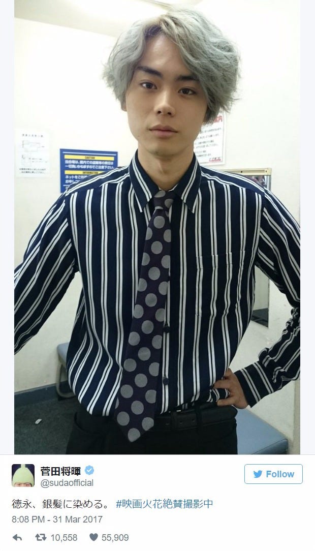 俳優の菅田将暉が、31日付のTwitterで銀髪姿を公開し、話題を呼んでいる。