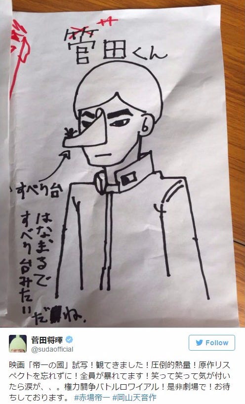 菅田将暉のLINEアイコンとみられる「岡山天音が書いた帝一の似顔絵」/菅田将暉Twitterより