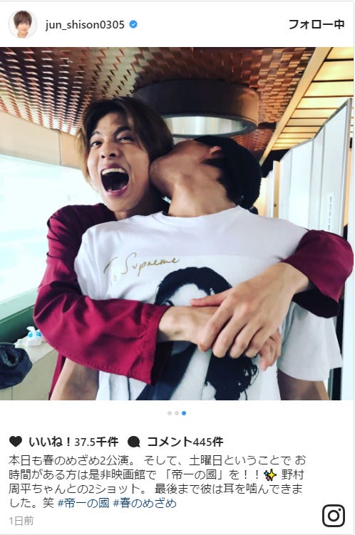 俳優の志尊淳が自身のInstagramにて、同じく俳優の野村周平に耳を甘噛みされている写真を公開。双...