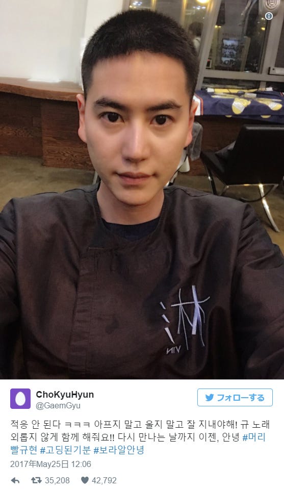 SUPER JUNIORキュヒョン、刈り上げ姿でファンに入隊の挨拶「泣かないで元気に過ごして」