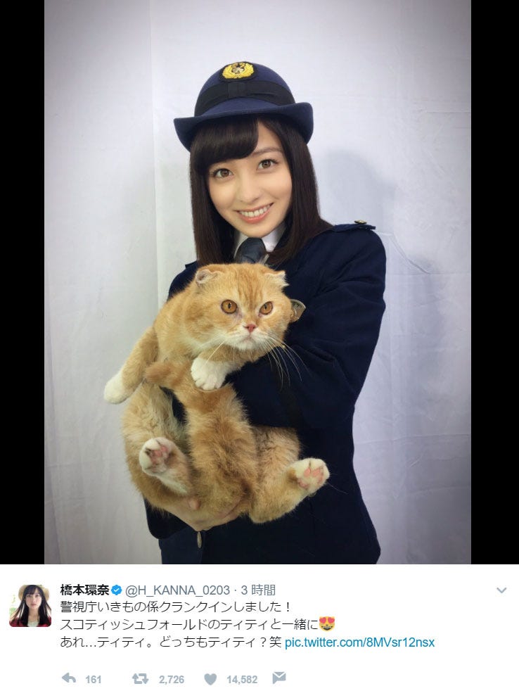 スコティッシュフォールドのティティを腕に抱く橋本環奈/橋本環奈Twitterより