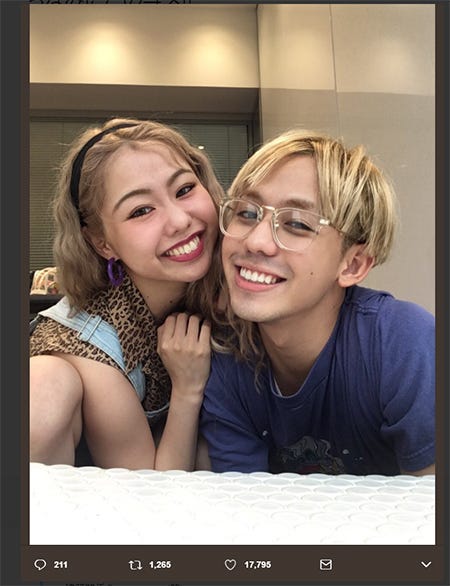 タレントのりゅうちぇるが14日、Twitterでタレントのぺこ(オクヒラテツコ)との2ショットを更新...