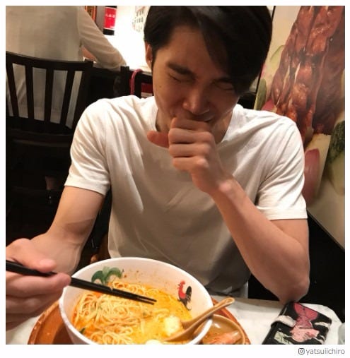 「ラクサ」に悶絶する磯村勇斗/やついいちろうInstagramより
