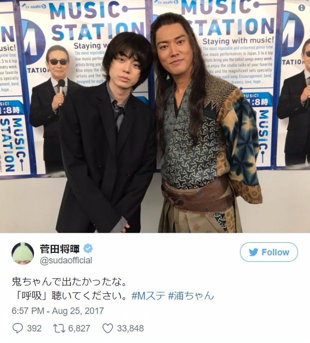 俳優の菅田将暉が25日、自身のTwitterを更新。同日生出演するテレビ朝日系音楽番組「ミュージック...