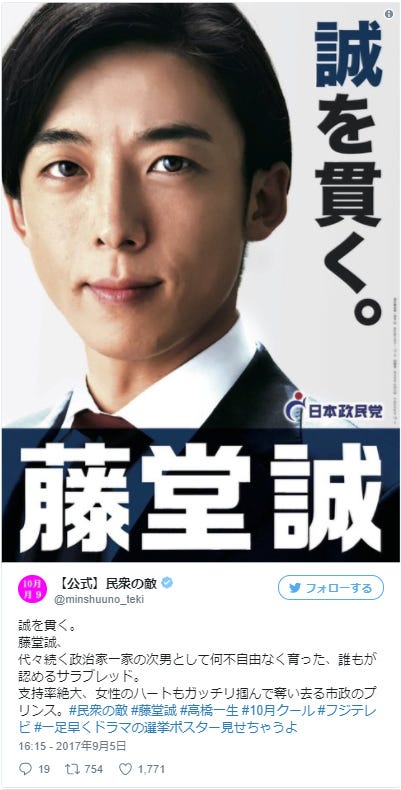 高橋一生演じる藤堂誠の選挙ポスター/「民衆の敵~世の中、おかしくないですか!?~」Twitterより