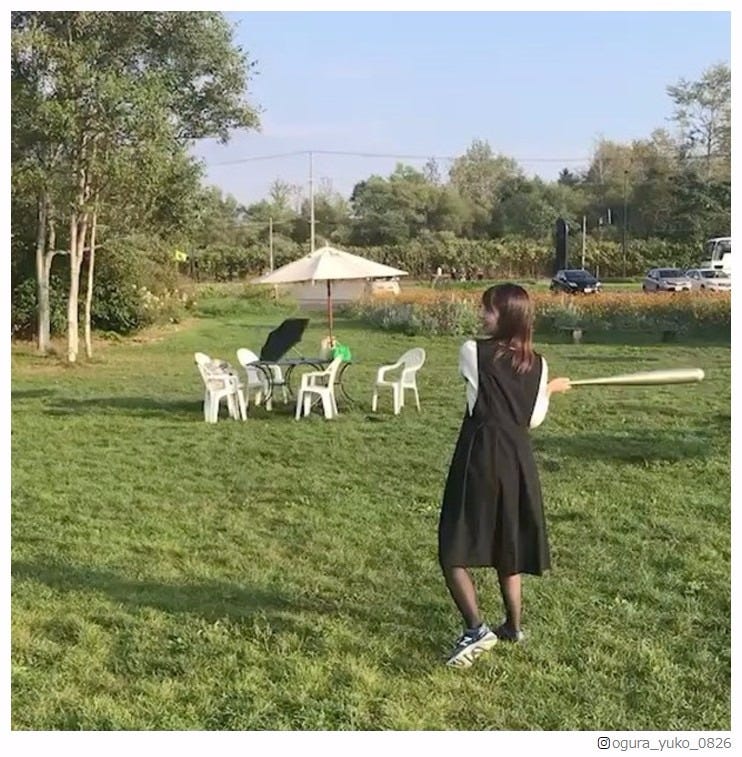 タレントの小倉優子が7日自身のInstagramを更新。小倉がバットを持って野球で遊ぶ姿を映した動画...