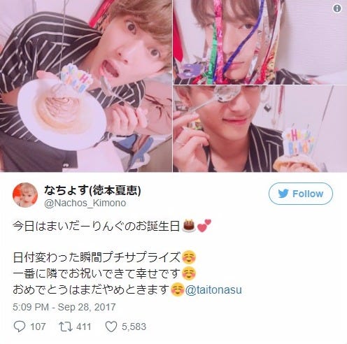 Popteenモデルなちょす、恋人・那須泰斗の誕生日に“プチサプライズ”/なちょすTwitterより