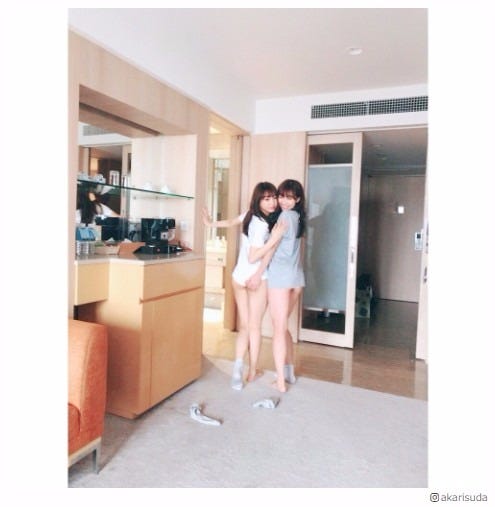 SKE48須田亜香里、元同期・木崎ゆりあとTシャツ1枚で美尻チラ見せ「見えてる!?」「刺激が強い」