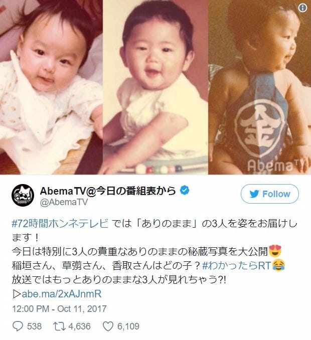 稲垣吾郎&草なぎ剛&香取慎吾(順不同)幼少期秘蔵写真/AbemaTV公式Twitterより