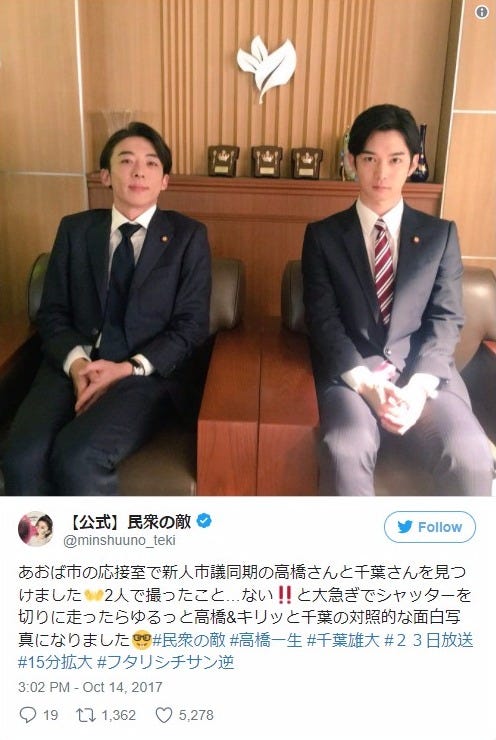 初の2ショットを披露した高橋一生・千葉雄大/『民衆の敵』Twitterより