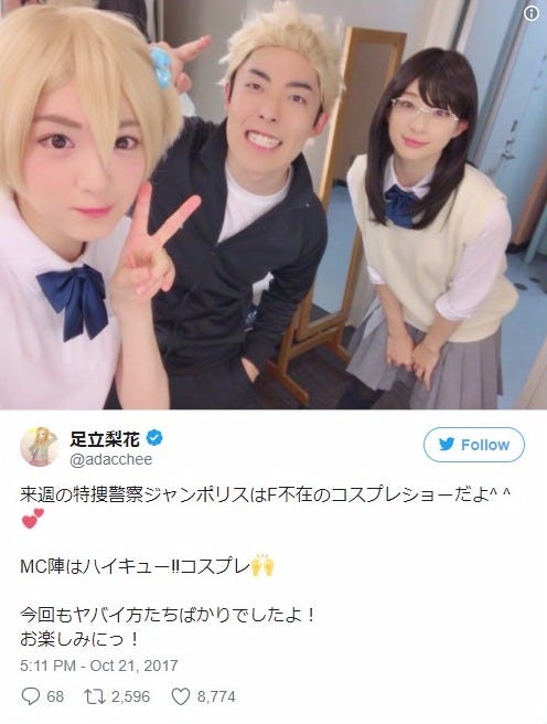 「ハイキュー!!」のコスプレをした生駒里奈・足立梨花・中田敦彦/足立梨花Twitter