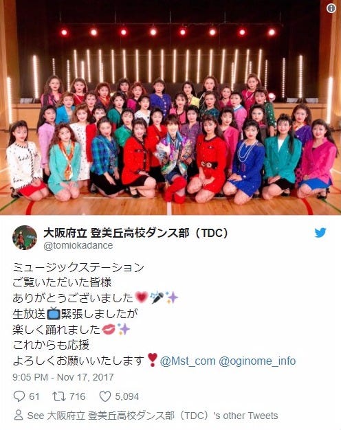 Mステでコラボステージを披露した登美丘高校ダンス部と荻野目洋子/登美丘高校ダンス部Twitterより