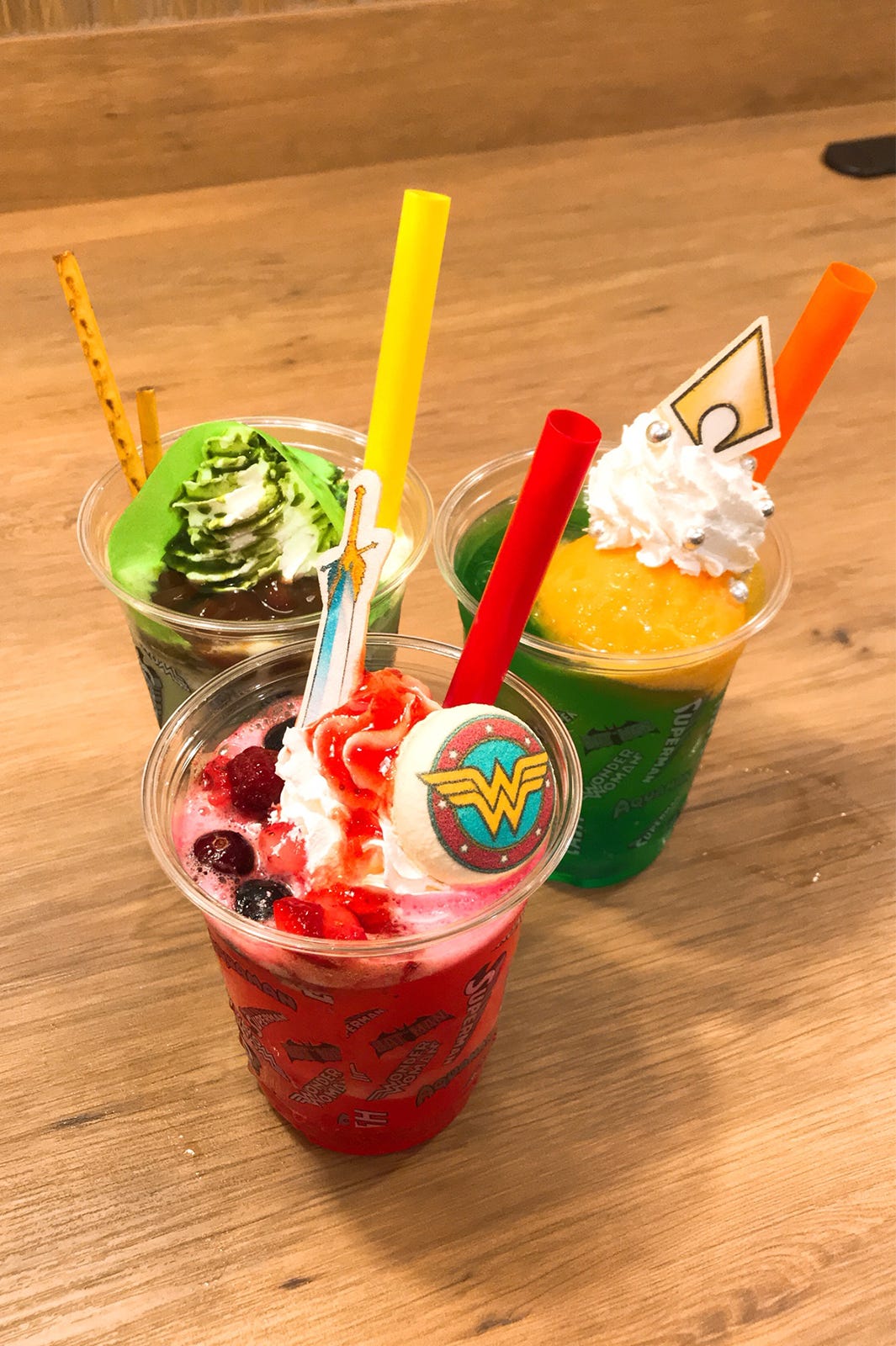 『ワンダーウーマン』スムージー¥700、『グリーンアロー』スムージー¥700、『アクアマン』ソーダフロート¥700 (提供画像)