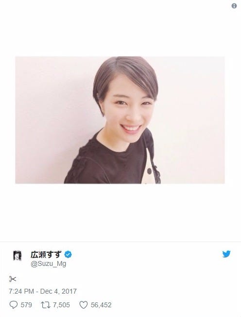 新髪型をTwitterで披露した広瀬すず/Twitterより