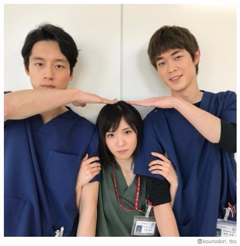 (左から)坂口健太郎、松岡茉優、宮沢氷魚/「コウノドリ」Instagramより