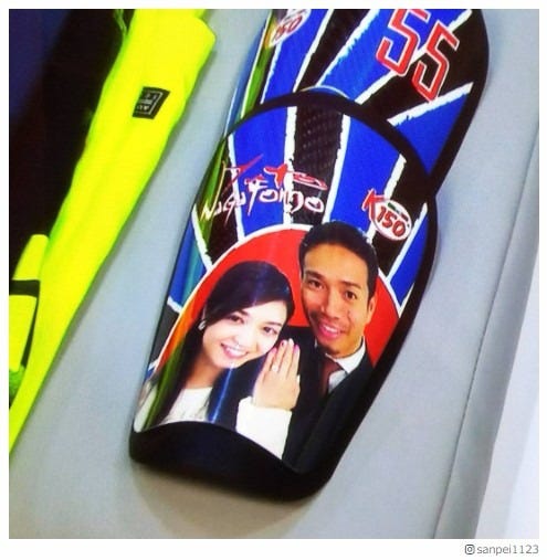 三瓶が投稿した、平愛梨と長友佑都選手の写真がプリントされた“すね当て”/三瓶Instagramより