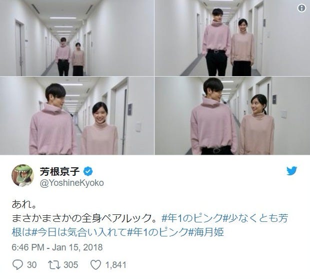 女優の芳根京子が15日、自身のTwitterを更新。俳優の瀬戸康史と全身のコーディネートが被ったこと...