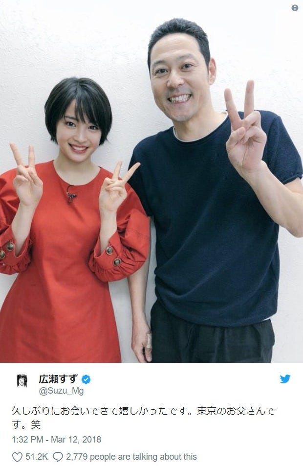 女優の広瀬すずが12日、自身のTwitterを更新。“東京の父”ことお笑いタレントの東野幸治との2シ...