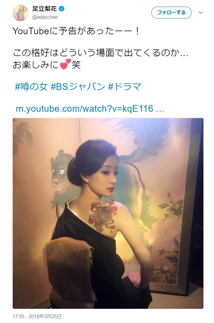 女優の足立梨花が25日、自身のTwitterにて刺青の入った後ろ姿を披露。衝撃ショットに反響が寄せら...