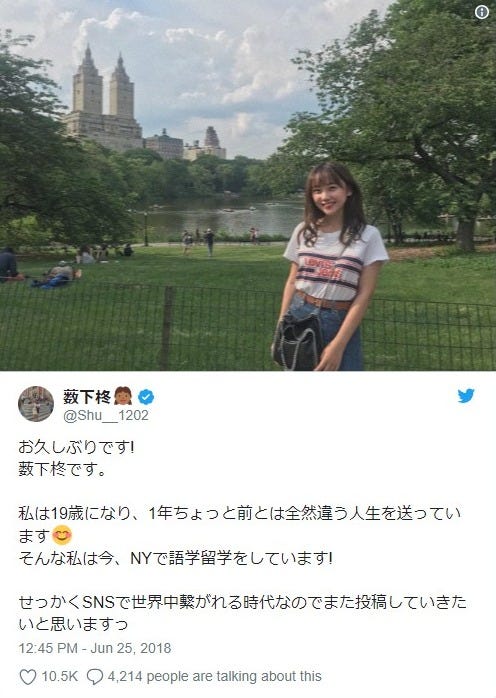 元NMB48薮下柊、“NYに語学留学中”卒業以来のSNS更新にファン歓喜