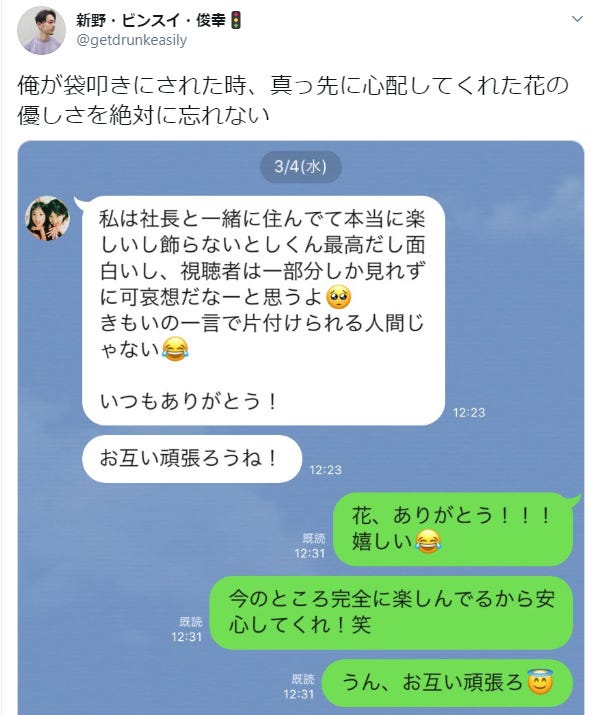 「テラハ」“社長”新野俊幸、木村花さんとのLINE会話公開「袋叩きにされた時、真っ先に心配してくれた」