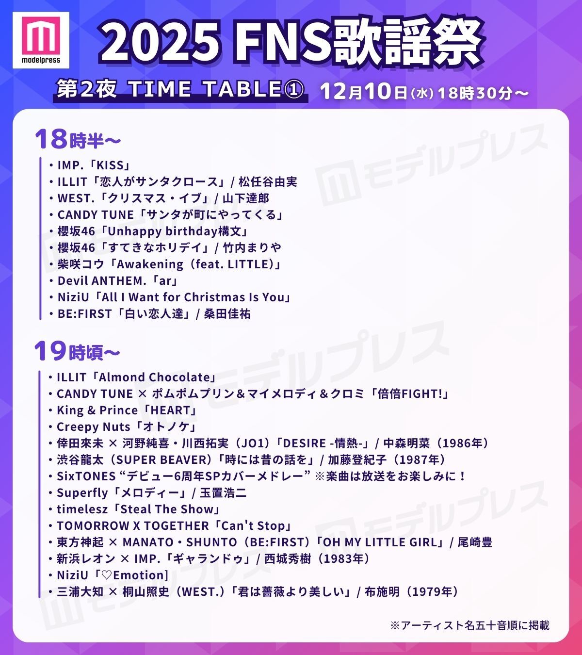 「2025 FNS歌謡祭」第2夜タイムテーブル公開