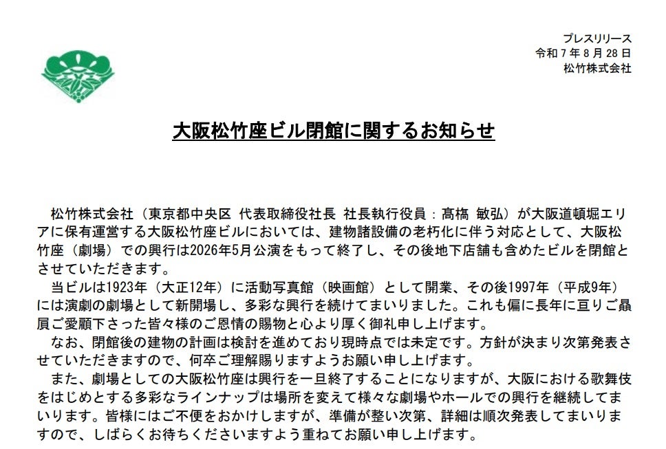 大阪松竹座、2026年5月公演をもって閉館へ「建物諸設備の老朽化に伴う対応」