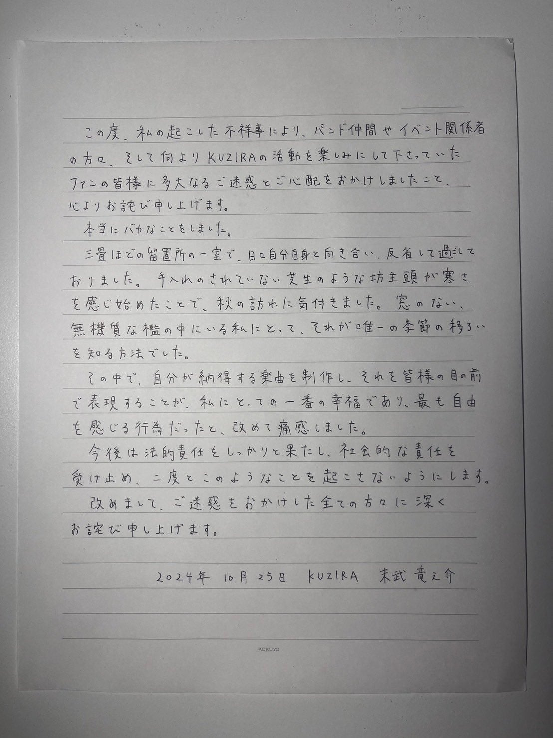 大麻所持の疑いで逮捕の「KUZIRA」メンバー、直筆謝罪文公開「留置所の一室で日々自分自身と向き合い反省して過ごしておりました」