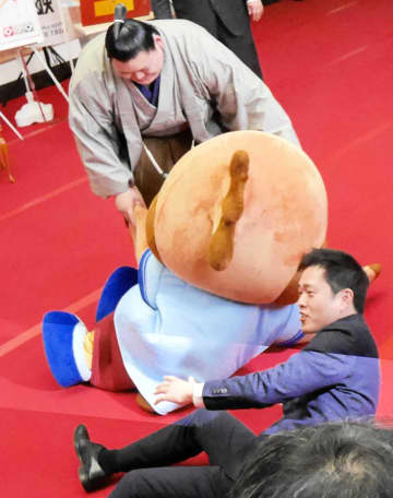 大の里 吉村知事をブン投げた!吉村知事「これで優勝間違いなし」 「もずやん」も転がした!